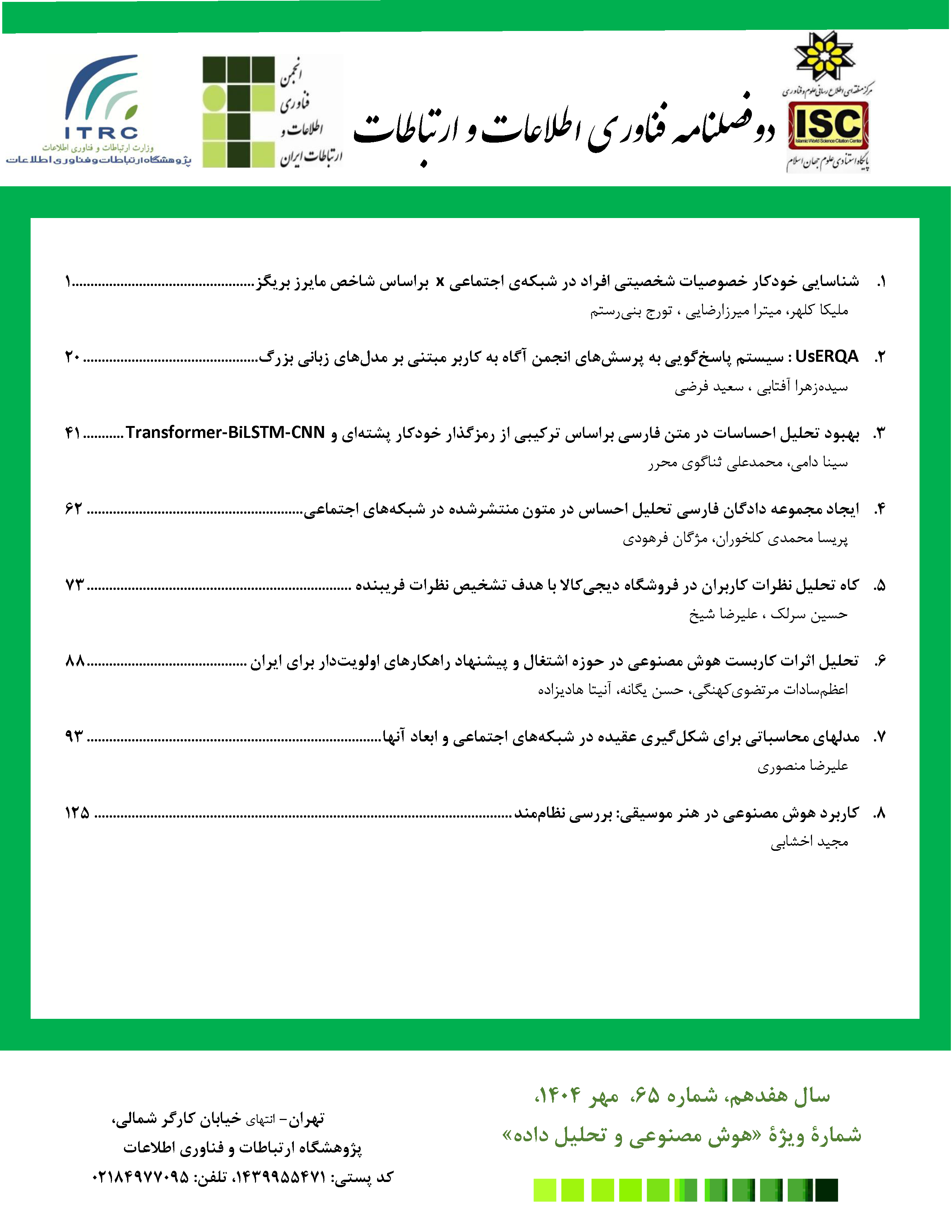 آخرین شماره دوره 17 شماره ویژه ارسال مقاله به نشریه شماره های پیشین دوره 17 ✓ شماره ویژه ✓ شماره 63 , 64 - بهار - تابستان 1404 دوره 16 ✓ شماره 61 , 62 - پاییز - زمستان 1403 ✓ شماره 59 , 60 - بهار - تابستان 1403 دوره 15 ✓ شماره 57 , 58 - پاییز - زمستان 1402 ✓ شماره 55 , 56 - بهار - تابستان 1402 دوره 14 ✓ شماره 53 , 54 - پاییز - زمستان 1401 ✓ شماره 51 , 52 - بهار - تابستان 1401 دوره 13 ✓ شماره 49 , 50 - پاییز - زمستان 1400 ✓ شماره 47 , 48 - بهار - تابستان 1400 دوره 12 ✓ شماره 45 , 46 - پاییز - زمستان 1399 ✓ شماره 43 , 44 - بهار - تابستان 1399 دوره 11 ✓ شماره 41 , 42 - پاییز - زمستان 1398 ✓ شماره 39 , 40 - بهار - تابستان 1398 دوره 10 ✓ شماره 37 , 38 - پاییز - زمستان 1397 ✓ شماره 35 , 36 - بهار - تابستان 1397 دوره 9 ✓ شماره 33 , 34 - پاییز - زمستان 1396 ✓ شماره 31 , 32 - بهار - تابستان 1396 دوره 8 ✓ شماره 30 , 31 - پاییز - زمستان 1395 ✓ شماره 27 , 28 - بهار - تابستان 1395 دوره 7 ✓ شماره 26 , 27 - پاییز - زمستان 1394 ✓ شماره 24 , 25 - بهار - تابستان 1394 دوره 6 ✓ شماره 22 , 23 - پاییز - زمستان 1393 ✓ شماره 20 , 21 - بهار - تابستان 1393 دوره 5 ✓ شماره 18 , 19 - پاییز - زمستان 1392 ✓ شماره 16 , 17 - بهار - تابستان 1392 دوره 4 ✓ شماره 14 , 15 - پاییز - زمستان 1391 ✓ شماره 12 , 13 - بهار - تابستان 1391 دوره 2 ✓ شماره 6 , 7 - پاییز - زمستان 1389 ✓ شماره 4 , 5 - بهار - تابستان 1389 دوره 1 ✓ شماره 2 , 3 - پاییز - زمستان 1387 صفحات نشریه • معرفی نشریه • برای نویسندگان • اصول اخلاقی • اطلاعات داوری مقالات • وضعیت دسترسی به مقالات • حق کپی رایت (CC) • اسامی داوران به تفکیک سال تماس با نشریه مرور • شماره جاری • براساس شمارگان نشریه • نمایه نویسندگان • براساس موضوعات • براساس نویسندگان